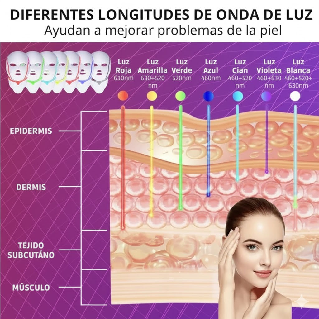 Por eso seleccionamos esta máscara LED de fototerapia facial, diseñada para estimular la piel mediante longitudes de onda específicas de luz, actuando directamente sobre las capas cutáneas.